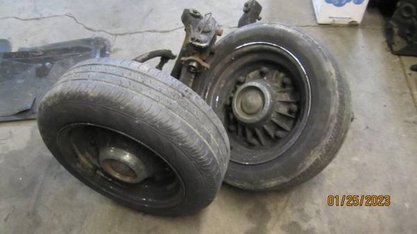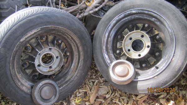 4 each Pontiac 8 lug 15" aftermarket wheels with center caps, needs refurbishing, 2 each center hubs for disk brake conversion (had drum machined off) and 2 each rears with drums attached, will bolt onto cars with drum rear and disk front. $295