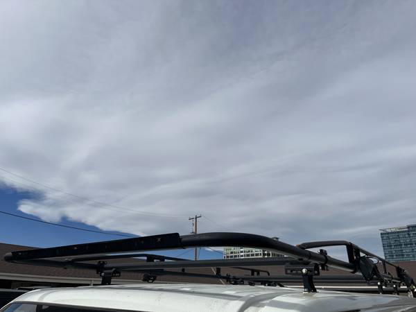 Steel rack for your business or pleasure. This fits currently on a Nissan 1500 Cargo Van. You will need to be able to remove from the van. See the pictures as to what that will entail. Cash Only