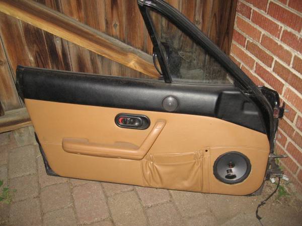Factory door from 1996 Miata M Edition. Includes all the hardware, glass, interior panel, arm rest, mirror, etc. It is only missing the speaker cover. Has all the factory wiring removed correctly with plugs.