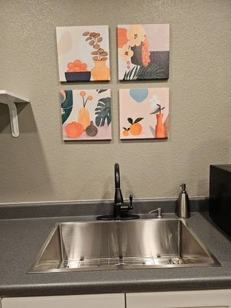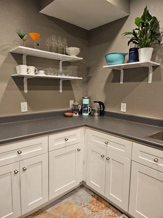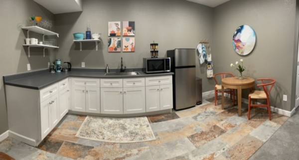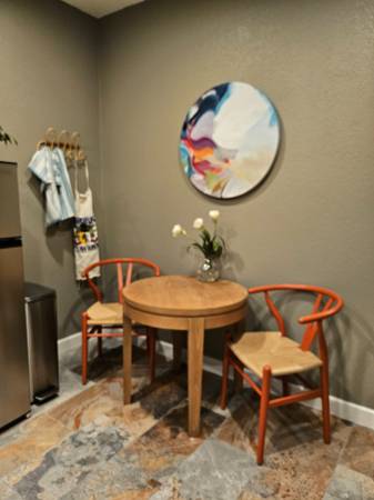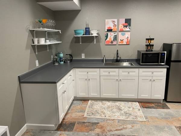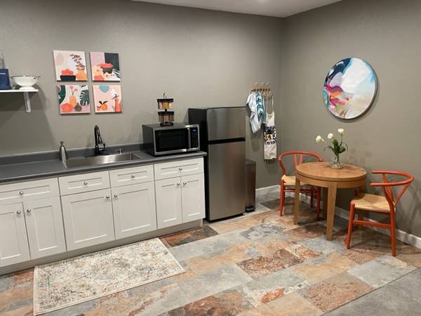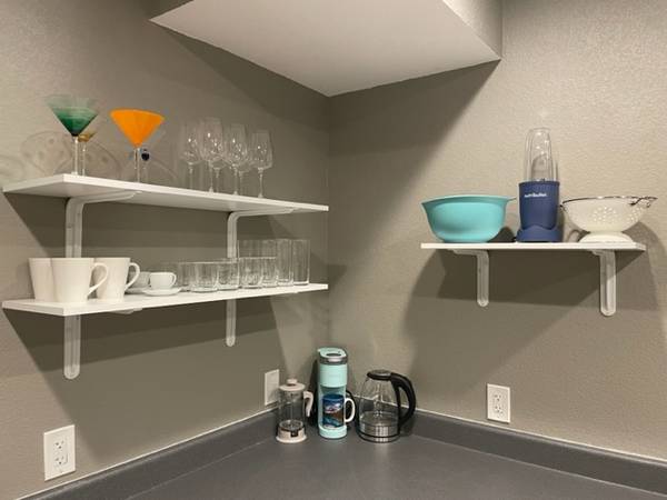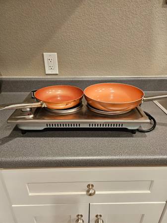 2-burner stovetop, Keurig, Nutriblender, and hand mixer. All dishes and utensils are included. Table and chairs also included.