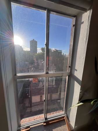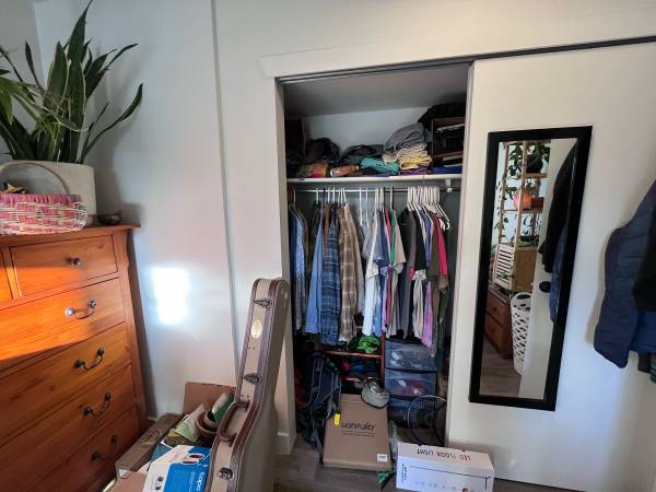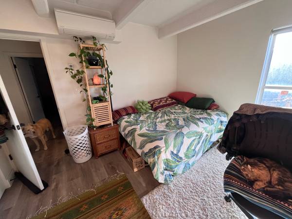 Bedroom: Tons of storage in the closet as well as a very tall window that lets a lot of light in the room. Personal wall AC Unit.
