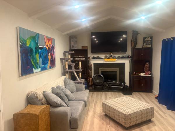 I am renting out bedrooms to help with finances. Ranch with finished basement where me and my lady live. Main level has 3 bedrooms, one with a private bath, Nice updated kitchen, family room and remodeled hall bath with large tub/shower. 2 doors and 1 doggy door to large back yard with outdoor kitchen, deck and couches. We are 420 plus and pet friendly. 2 cats and 1 dog are here now.