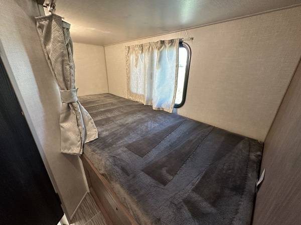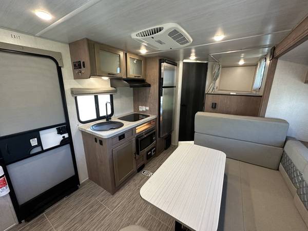 One of the roomiest bunkhouse models in our entire product line – you can equip this sub-3,800 bunkhouse model with two slide out configurations: Chaise style dinette, or sofa. Both options provide plenty of interior room and extra sleeping capacity. A huge rear bath and extra-large capacity double-door refrigerator make sure you have all the room you need for your entire family to enjoy the next camping adventure.