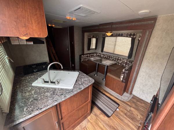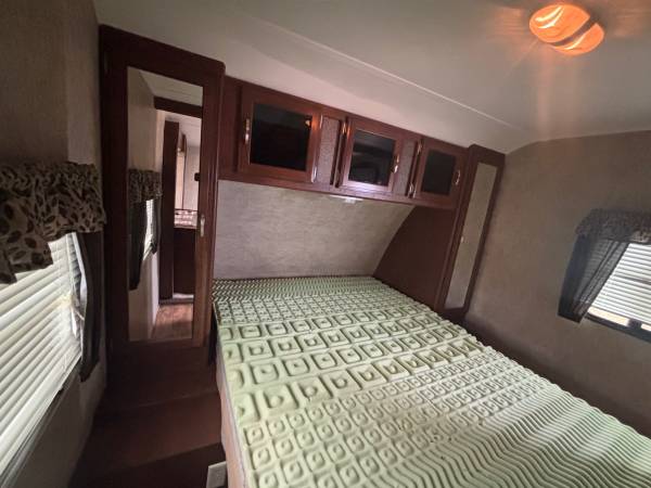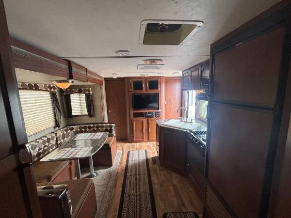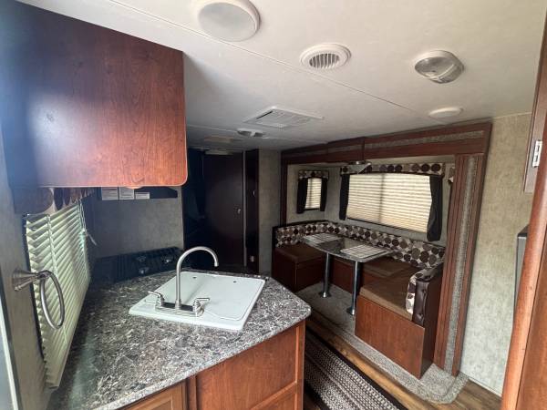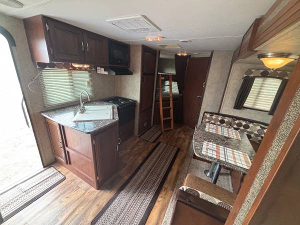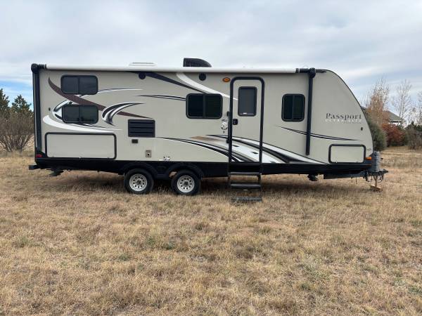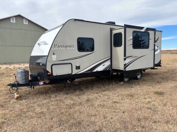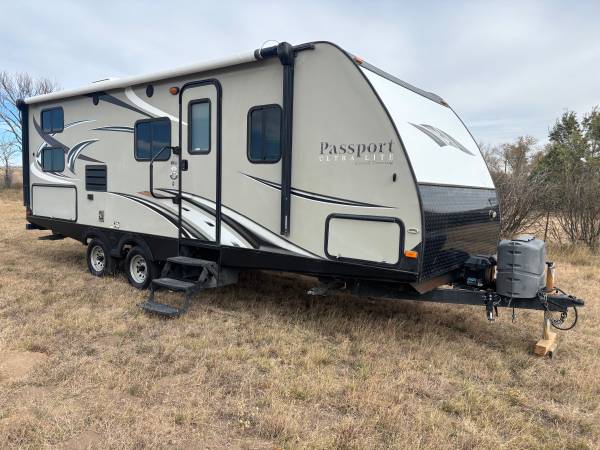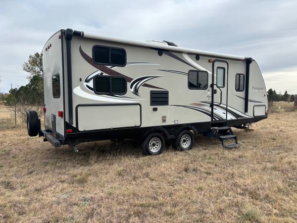 2015 23ft passport, ultralight travel trailer with slide out . All fiberglass tandem axle central AC. Heat. Electric Awning. Fully self-contained. This trailer is very nice and clean and has been very well-maintained queen-size walk around bed in front with bunkbeds in back and dinette also makes into a bed. Sleeps 6 Non-smoking no pets always been covered only been used for Camping. tons of storage space also has outside kitchen has good tires good batteries