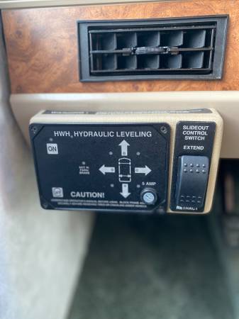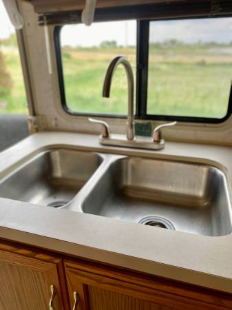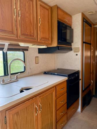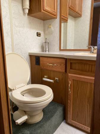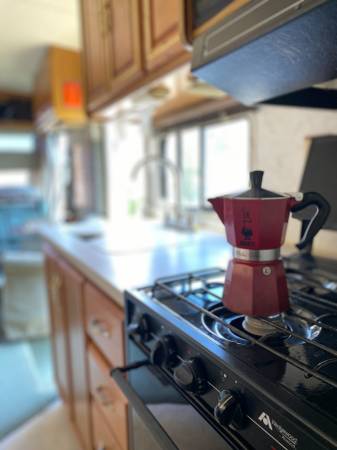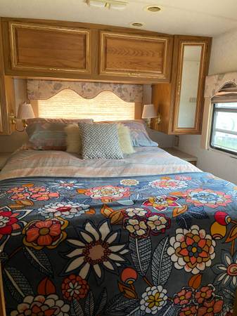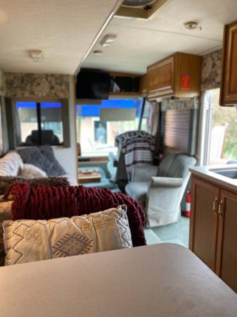 It’s 34 feet of rolling comfort with a 19 ft slide-out, queen master in the back, full bathroom, convertible dinette, and futon. Two flat-screen TVs, two rooftop ACs (run by an Onan 5000 generator), floorboard heat, 6 gallon water heater, and a full kitchen with plenty of cabinet space mean you’re set for four-season living, whether that’s tailgates, road trips, or full-time RV life vibes.
