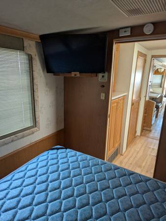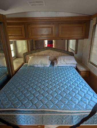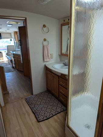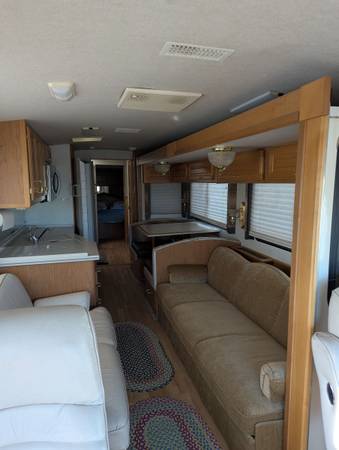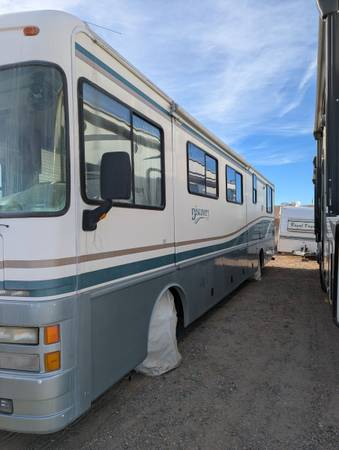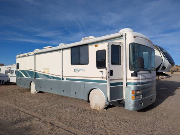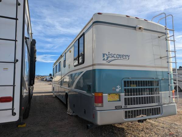 For sale is my 1999 Fleetwood Discovery 37V with 5.9L Cummins Diesel I-6. Asking $25000 or best offer. Will continue using it through the summer until it's sold. Just got back from a trip to Yellowstone while towing my Jeep, runs flawless with only 69k miles. Will pull over mountain passes no problem. Just changed oil on motor and generator. Newer batteries, always pulled out for winter and put on trickle charger. Winterized every year, hot water system works great. Both AC units on the roof were replaced just this month. Onan diesel generator will run both AC's and the fridge at the same time. Shore cord for 50/30A connections. Interior is still in great condition. New roof was recoated last year with Henrys Tropicool, no leaks! Two slides, queen bed, two pullout couches and kitchen dinette becomes a bed as well if needed. Clear coat is starting to oxidize near back. Great RV for pulling a RZR, side by side, or jeep.