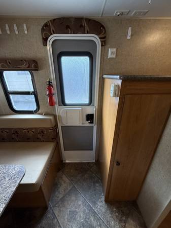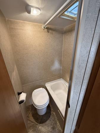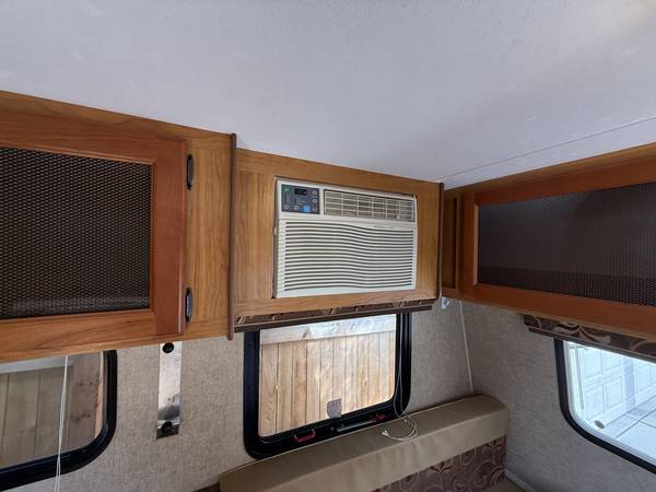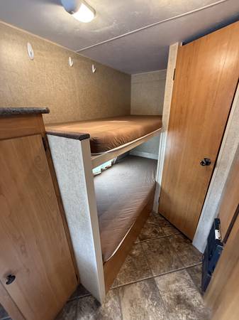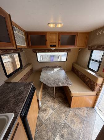 Model 16BH. Sleeps 4 with fold down table (2) and bunch beds (2). Has been used very little last 5 year. Never smoked in or used by pets. Retractable awning, air conditioner, microwave, heater, hot water, shower, toilet, sink, refrigerator, and abundant amount of storage. Coms with battery and propane bottle. Can be pulled by most SUVs.