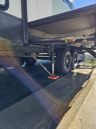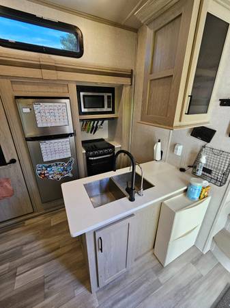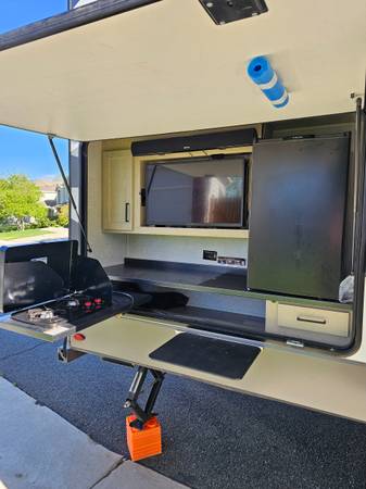 This fifth wheel also offers a range of premium amenities, including a built-in outdoor kitchen/entertainment center, an awning for shade on sunny days, outdoor shower, 2-burner stove top (propane quick connect), BBQ grill (propane quick connect), wall mounted griddle (propane quick connect), wall mounted accessory table top.