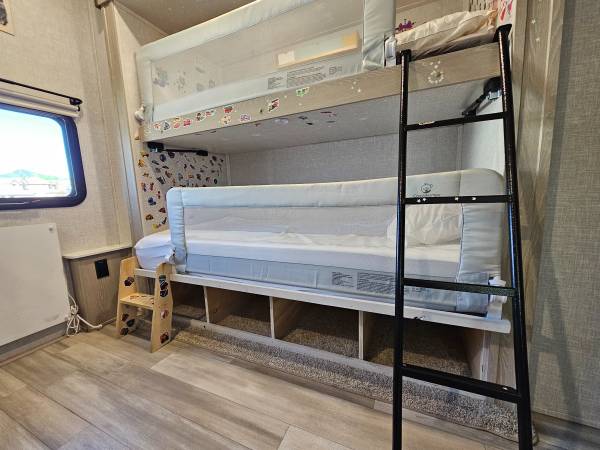 The Bunk Room has two top bunks, one lower bunk with a true twin size memory foam bed, ample storage, with an outlet for a TV as you lounge. This Bunk room has its own toilet and washroom with more storage for bathroom things.