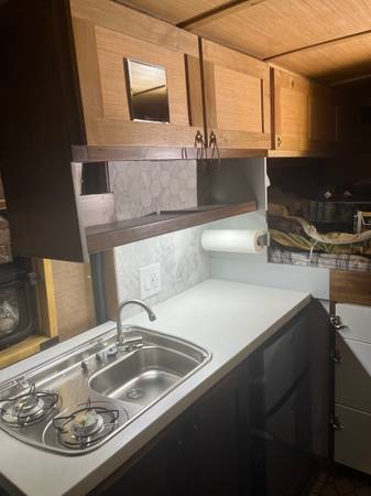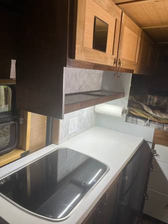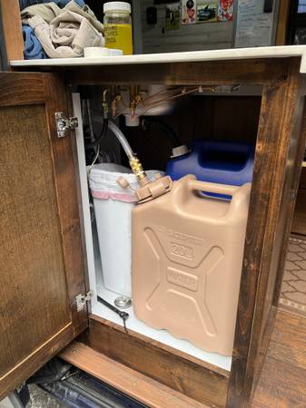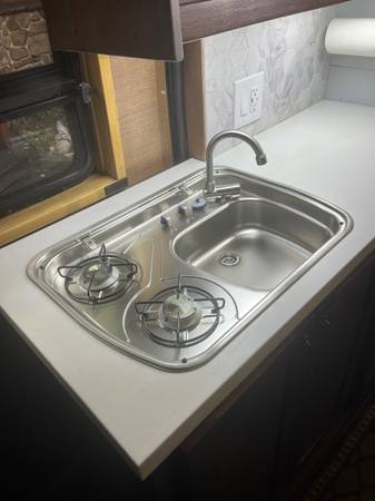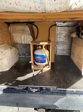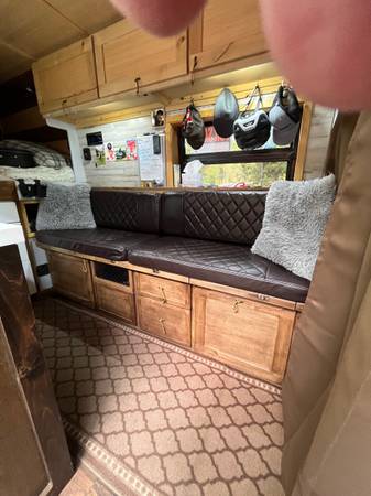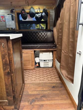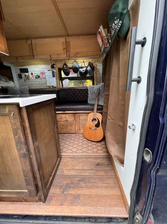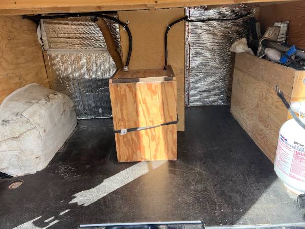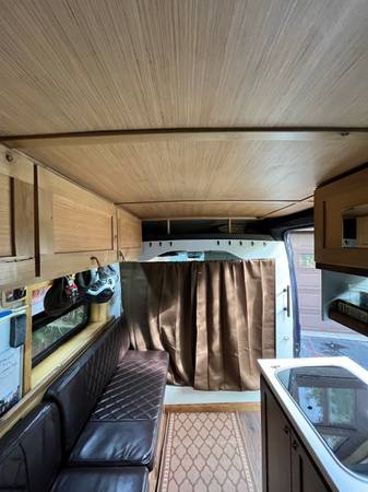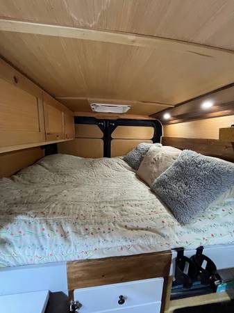 I built out the van myself. Its very well insulated for those cold winter nights. It is equipped with a Propex propane heater which vents outside. The solar system has a 200 watt panel and 160 amp hours and a 3000 watt inverter/ charger which is set up to run shore power thru it or autswitch to battery power. There is a two burner (propane) /sink combo. The pump turns on automatically and draws from a 5 gal container. The bed sleeps two comfortably with the option for a third person in the convertible bench seat. There is enough room in the garage area to fit a bike (or two). Plenty of storage in the cabinets. There is also a porta potty under the bench. Must see it to appreciate it. Please reach out with questions. Thank you