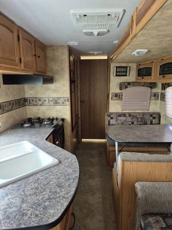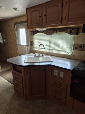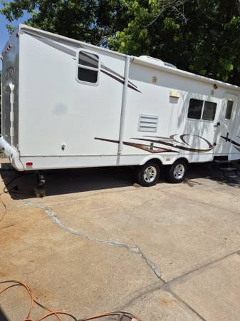 Sleeps 6. Walk around queen bed with storage closet each side and cupboards above. Extra large bathroom goes across entire back of trailer, walk in shower, dual sinks and lots of storage. 3 burner stove, combo microwave and convection oven, 3 way fridge, large food pantry. Slide out with sofa and dinette. Ducted heat and a/c. Pass thru storage, more storage at rear. Awning, outside grill, outside shower. Equalizer sway control hitch. New power tongue jack, 2 new batteries.