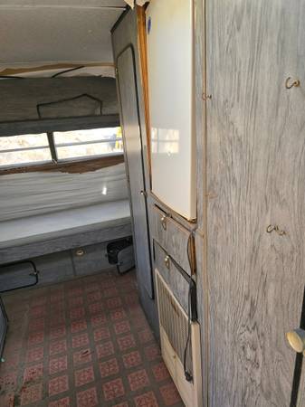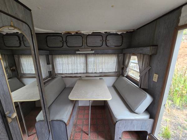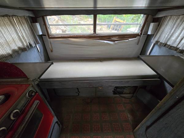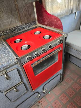 Sturdy, well built 16 ft cabin, high ceilings, high ground clearance. GREAT FOR HUNTING CABIN, AIRBNB, BACKYARD GUEST COTTAGE, ETC Vintage red appliances, ROOMY BATH WITH SHOWER Front dinette...