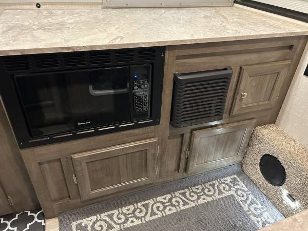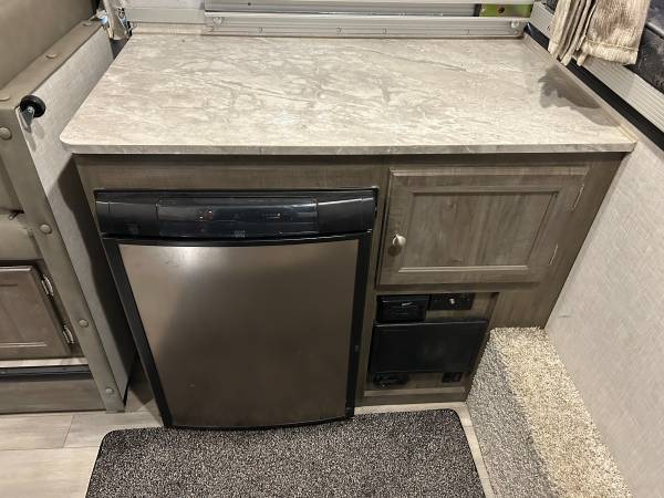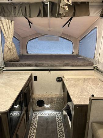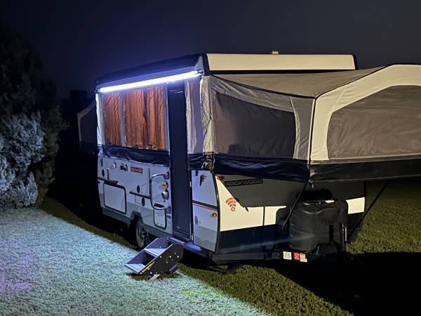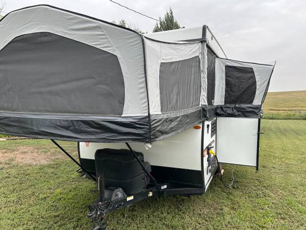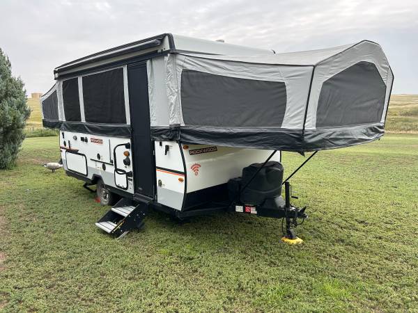 Used a handful of times. Best popup I have ever had or been in. Heat, A/C, microwave, stove, oven, heated beds, indoor toilet, indoor and outdoor showers, indoor and outdoor sinks, outdoor griddle, slide out kitchen table, heated beds, lighted outdoor, stereo w/bluetooth. This one has everything.
