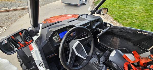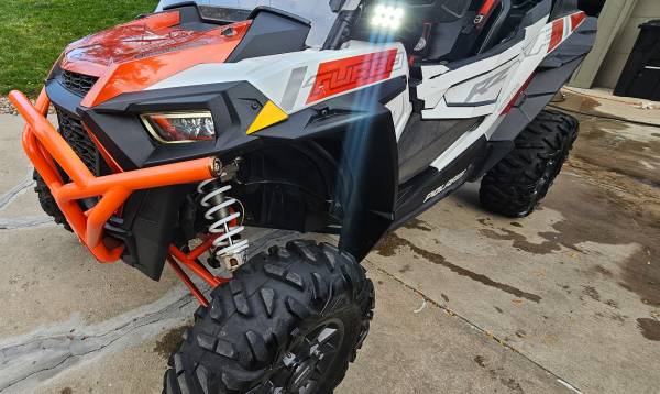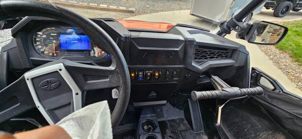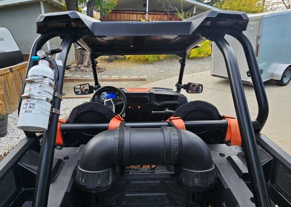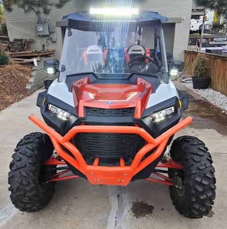 This one has an aftermarket BOV, multi-point harnesses on both seats, HD front armor, hard cover roof, door panels, BT marine sound tube, AuxBeam front LED bar and pods on the aftermarket HD mirrors.