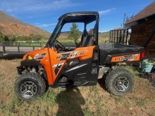Very nice machine runs great! Roof, windshield, dump bed, half doors. Good for hunting, camping, around town or ranching. Smooth running