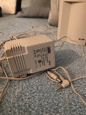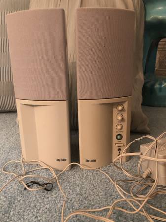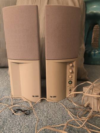 Labtec computer speakers with volume control and power adapter.