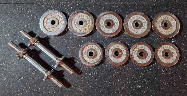 Gold's Gym Weight Plates and Dumbbells. Includes: •Five 5-Pound Weight Plates •Four 3-Pound Weight Plates •Two Adjustable Dumbbells •Four Dumbbell Clips Pickup in Aurora near Quincy and Picadilly.
