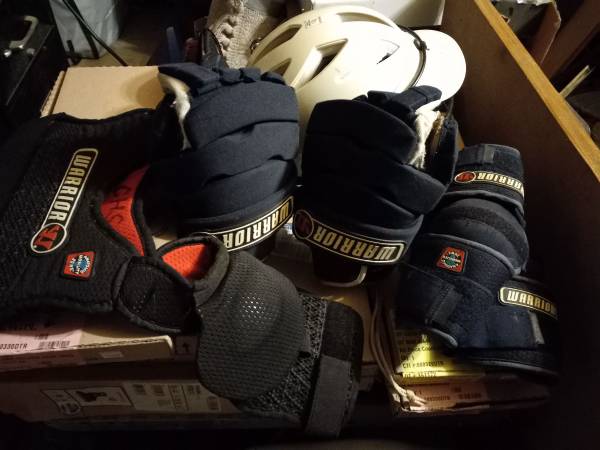 Bad pics but good gear. Full set of LAX gear. Helmet, elbow/ arm pads, chest/ shoulder pads, gloves. Warrior brand. Only used for one season.
