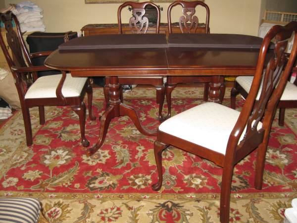 Cherry table 6 chairs 2 extensions top cover/pads. Excellent condition!