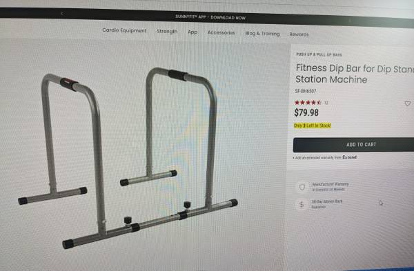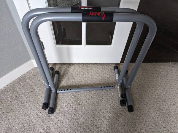 Parallel Dip Bars in excellent shape! Just a small chunk missing from one of the grab handles (see pic). Approximately 30" tall, can be nested and tucked away. I'm selling to make space for another...