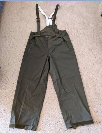German military Gore-Tex pants w/ suspenders. OD green. Excellent condition. They have been worn briefly but still have creases from when they were new.