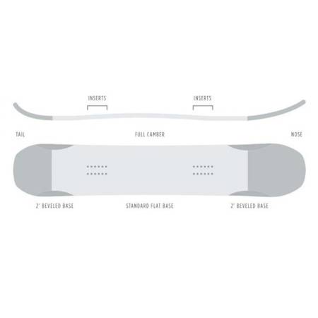 Profile: An innovative traditional camber profile tweaked to offer the insane edge response of camber without the usual hang-ups. The board profile crosses over into the third dimension as the base is beveled up at the edges from the contact points of the camber to the ends of the board. The base beveling releases the edges where they like to hook which balances the pop and directional stability of camber with a looser, less-catchy feel.