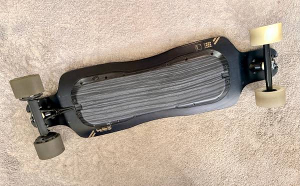 Like new ($1199). 75 miles on it. Too much for my old bones. Comes with board, charger, controller, and wheel wrench. BOARD: Length: 35.5" Width: 10.0" Wheelbase: 29 - 29.8" Concave: 0.63" Trucks:...