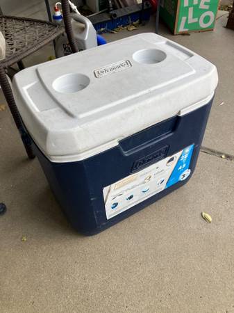 Moving Sale! This hard-sided cooler is scratched from a few years of use, but it's decently clean inside, doesn't leak, has a solid handle, has two cupholders on the lid, and can support the weight of a seated adult. $10, pickup in Elyria/North Denver, cash or Venmo at pickup only. Check out my other ads for more moving sale items!