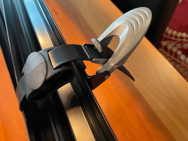 The Thule 724 Flat Top rack has 16" of loading space for 3-4 pairs of skis (depending on ski width) or 2 snowboards. The large push button releases are easy to open while wearing gloves. Comes with mounting clamps that fit the Thule included square bars. The racks have a total width of 22” and fit between the Peloton bike trays in a typical setup. 2 lock cores, keys and all hardware. No tools required.
