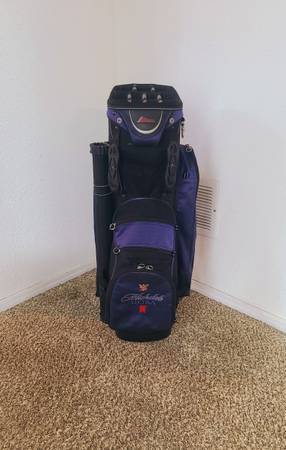 The Datrek Navigator IDS cart bag features a 14-way top with full-length individual dividers, a dedicated putter well with an integrated rubber grip, and a patented TOP-LOK cart attachment system. It offers seven pockets, including an insulated cooler pocket and a velour-lined valuables pocket, plus a removable panel for customization