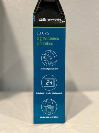 The Emerson 10x25 digital camera binoculars are a sleek and versatile field accessory designed for outdoor enthusiasts. With a silver color and a compact design, these binoculars offer 10x magnification for clear and detailed viewing. The included digital camera allows users to capture images of distant objects with ease. Perfect for birdwatching, hunting, or simply enjoying the great outdoors, these Emerson binoculars provide a convenient and high-quality viewing experience. *NOT tested or used, still in its original packaging*