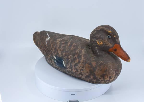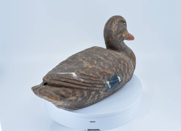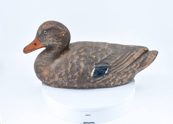 Vintage 1940's-1950's paper-composite female Mallard duck decoy, made in the USA; both glass-eyes intact; 14" long (tip of tail to tip of bill); 6" wide; 7" tall; 15 oz.