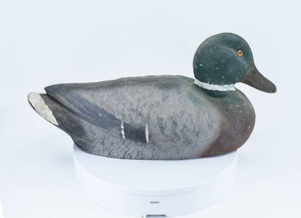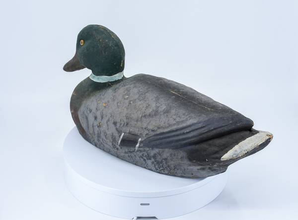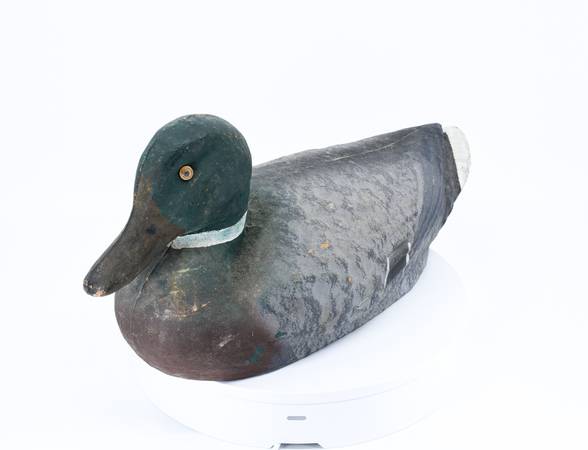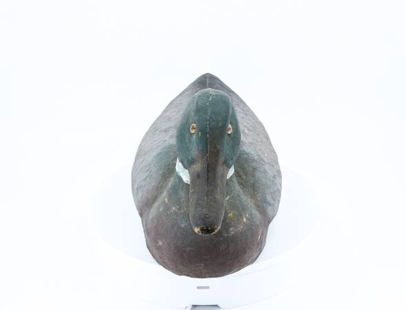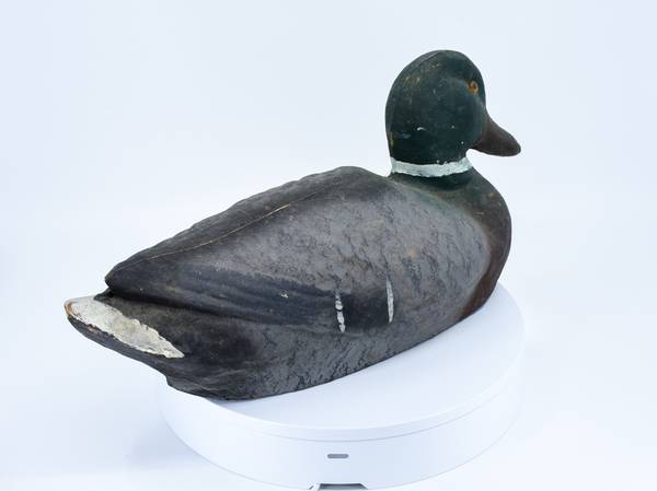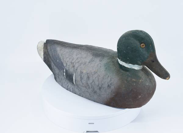 Vintage 1940's-1950's paper-composite Mallard duck decoy, made in the USA; both glass-eyes intact; 14" long (tip of tail to tip of bill); 6" wide; 7" tall; 15 oz.