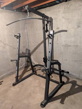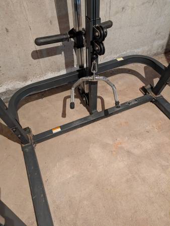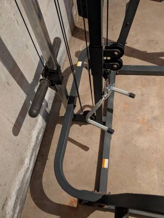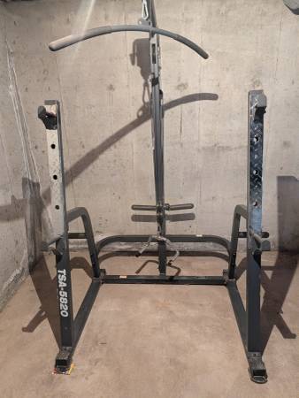 For sale: TSA 5829 weight system, bench, squat rack, lat cable system, row cables, Located in Fort Lupton. Comes with accessories. Weight are not included. D-handle, straight tricep bar, row matching bar.