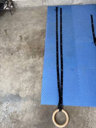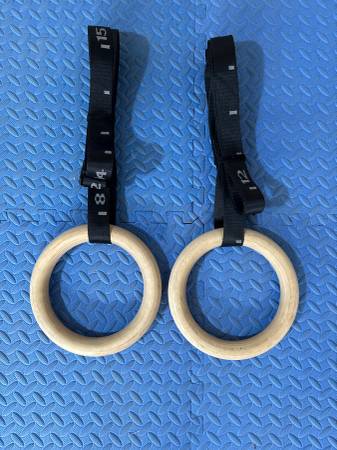 Wood Wooden Gymnastics Rings Workout Rings Gym Rings in great condition. CrossFit-compatible. Features: Non-slip wood rings Two adjustable numbered straps included Strap length Appx 15' Ring outer...