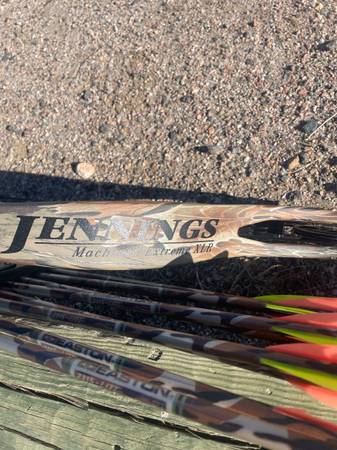 Jennings compound bow in like new condition, adjustable 30 to 70 pull. String length 59.5.comes with 9 Easton arrows four have broad heads and some practice arrows and 1 varmint arrow, hard case