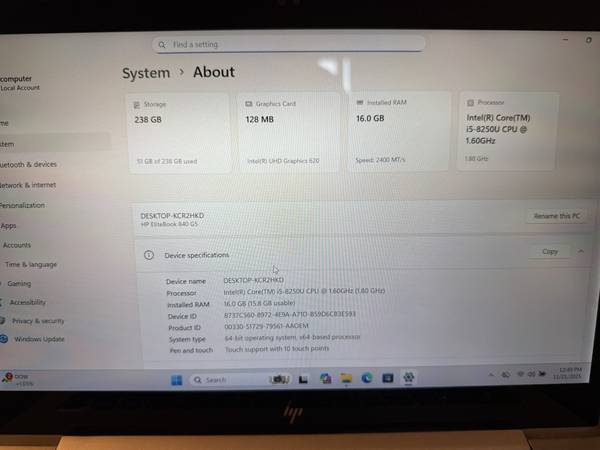 hp elitebook 840 G5 touch screen intel i5 at 1.60, 1.80ghz 16gb ram...