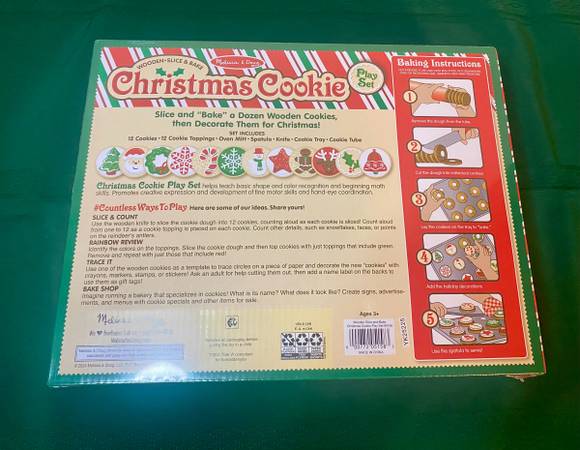 Slice and "bake" a dozen wooden cookies for a sweet playtime treat! This colorful wooden set includes 12 wooden, sliceable cookies and 12 toppings, wooden knife, spatula, cookie sheet and a kitchen mitt for safe, deliciously imaginative play! The cookies store in a durable dough tube.