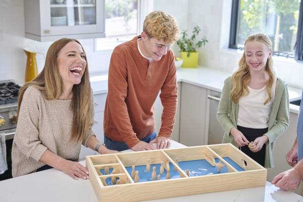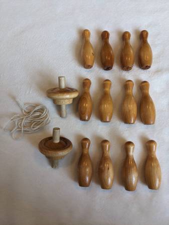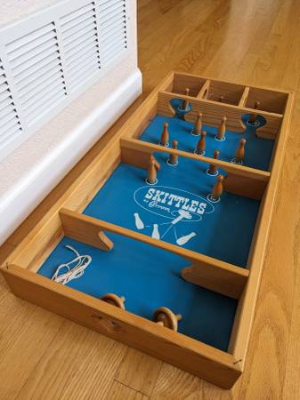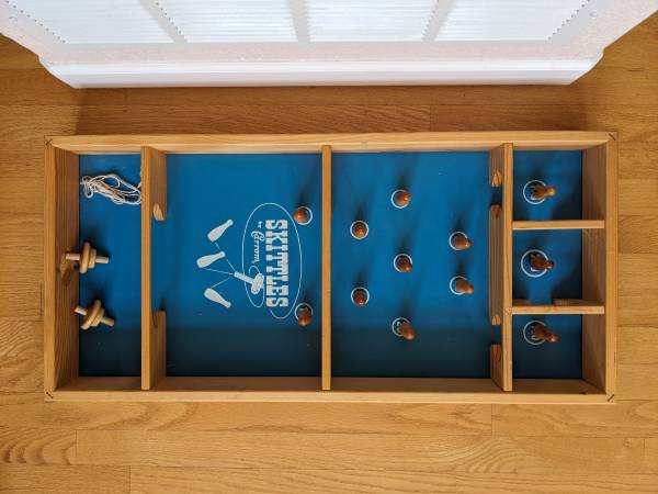 Tabletop Skittles by Carrom game. In very good condition. A blast from the gaming past! This tabletop game of wooden pins and spinning tops dates back centuries to Old England. Opponents take turns spinning the top and knocking down pins for points. It’s part skill, part luck, but all fun. Game was handmade in Michigan. Skittles board dimensions are 32” long by 15” wide. Includes all of the original hardwood accessories.