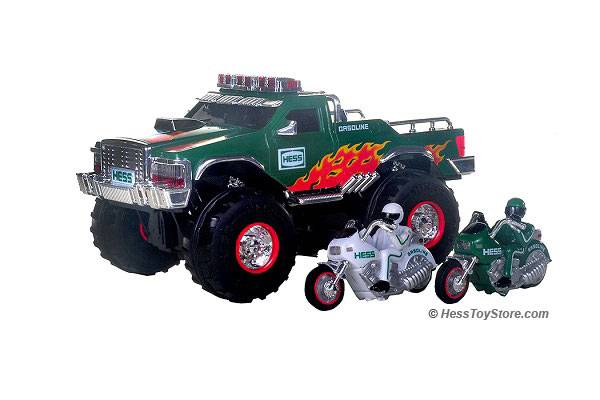 Brand new Hess Toy Monster Truck with 2 Motorcycles. Brand new mint condition in collectible carton. We have 2 to sell. One for $30 or both for $50. Takes 2 "C" cell batteries, not included. Has flashing red lights and siren sounds. Very collectible toy truck and perfect gift for birthday or holiday gift.