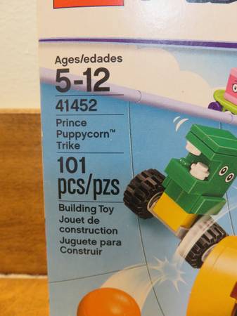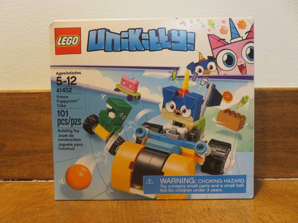 Description: This listing is for one LEGO Unikitty 41452 Prince Puppycorn Trike building set from LEGO. This set was available starting in 2018 and is now retired. This set contains a total of 101 pieces. It is in the original packaging and has never been opened. LEGO item number is 6213839.