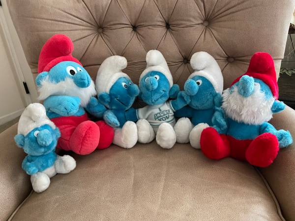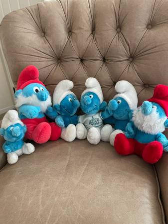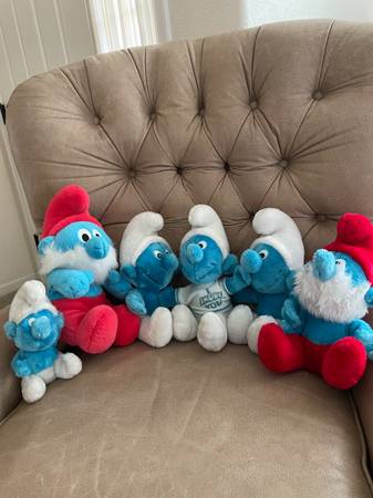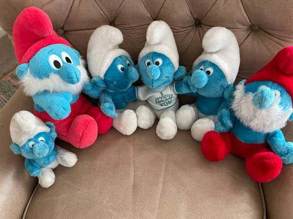 Set of 6 Vintage Stuffed Smurfs made by Peyo Wallace Berry. Four were made in 1979, one was made in 1980 and one was made in 1990. They range in height from 8 inches to 13 inches. One is wearing a “I Smurf You” shirt. Used but in good condition. Selling as a lot.