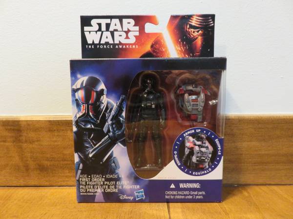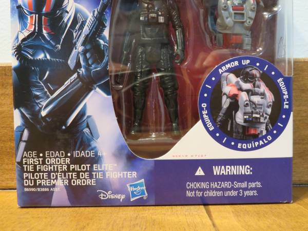 Description: This listing is for one First Order TIE Fighter Pilot Elite action figure by Hasbro. This figure is from the Star Wars The Force Awakens collection which has the Kylo Ren art on the card. This figure is part of the Armor Up series featuring additional armor accessories for the figure. This figure was available in 2016. Accessories include a First Order blaster pistol and Space Chest Armor. It is in the original packaging and has never been opened.