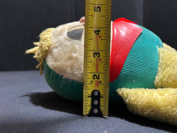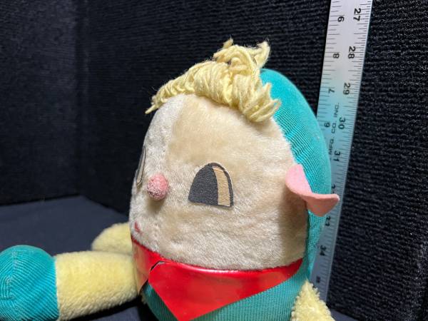 Hi, I have a Vintage Humpty Dumpty Toy Knickerbocker Toy Co MUSICAL CHIME PLUSH TOY for sale. It is still in decent shape. He is very dirty and does have some stains. He is also missing an ear. He does have a split in his collar.