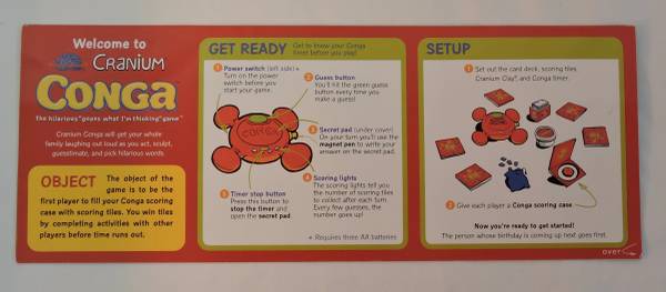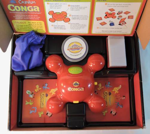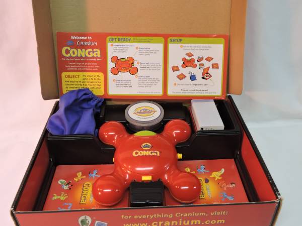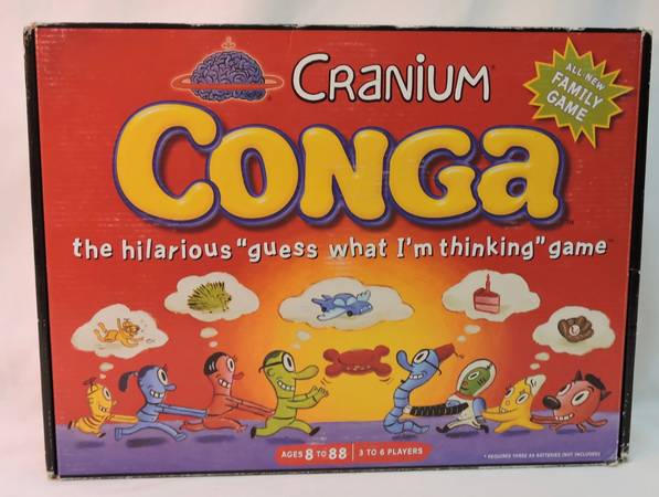 Hasbro Cranium Conga Strategy Game. It's a fun 3D pyramid strategy game where you match, stack and top pyramids to win! For 3 to 6 players. Clean. Pre-owned. Like new interior and pieces. Includes original container labelled Cranium clay. Exterior of box is a bit worn from storage and a move.