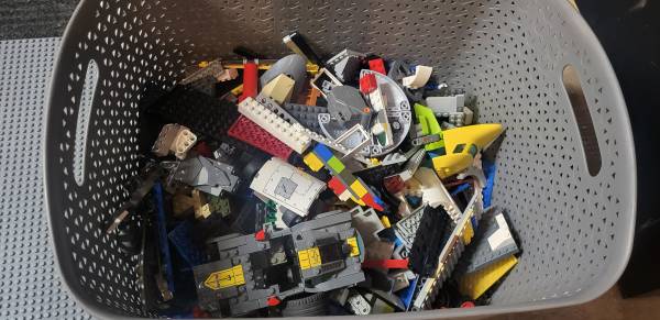 Bin of various Lego bricks, many different bricks, a huge, creative variety.