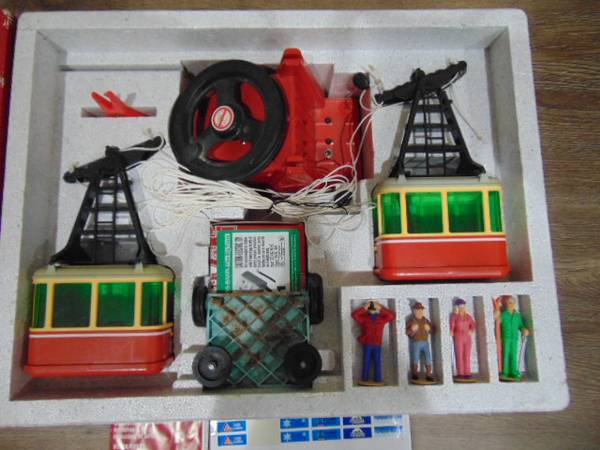 I DID TEST ITS' POWER SUPPLY WHICH WORKS AND DID A ROUGH SET UP TO SEE IF THE CURRENT STRINGS FOR THE TWO CABLE CARS WERE SET UP TO ROTATE CORRECTLY. IT DID LOOK LIKE THEY WERE. THE FIRST OWNER USED THE CURRENT STRINGS FOR IT BUT THE ORIGINAL PLASTIC STRINGS ARE IN THE BOX. THE ONLY THING I CAN SEE MIGHT BE MISSING IF IT HAD A CARDBOARD SKI STOP.