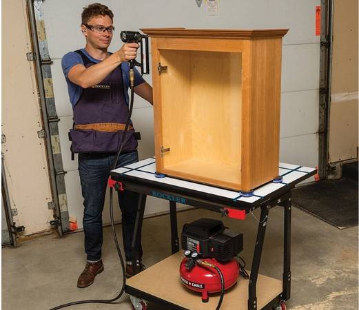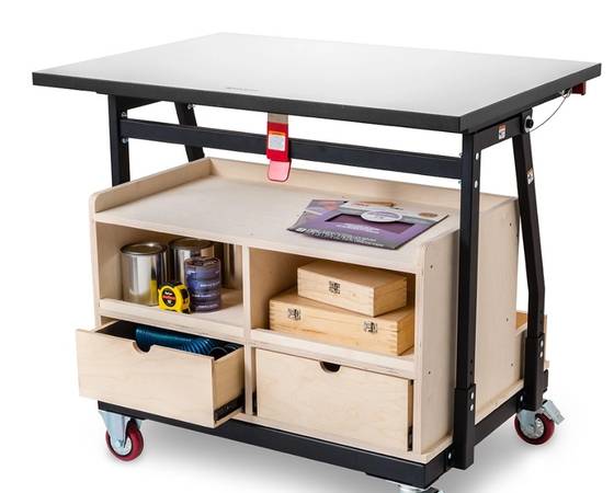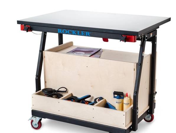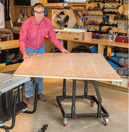 The Rockler Material Mate Panel Cart/Shop Stand lets you easily roll 4' x 8' sheets from your truck or lumber rack to your table saw. The tilting top allows convenient loading if you store your sheet stock on edge, a common space-saving practice in small shops. With the Material Mate tilted, the sheet can be transferred from the rack with minimal repositioning. The vertical position also allows passage through a service door as narrow as 30'', and provides a more compact footprint when not in use. With the top in the horizontal position, you can unload sheets directly off the bed of your truck. When not in use as a panel cart, you can add a top and use the Material Mate as a mobile shop stand, work table or outfeed table.