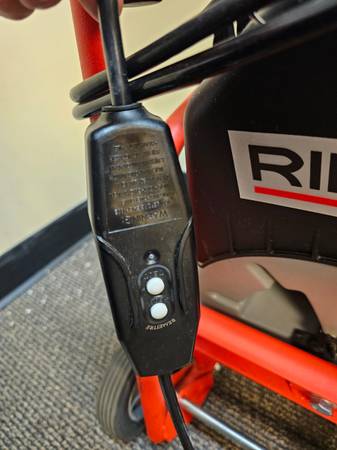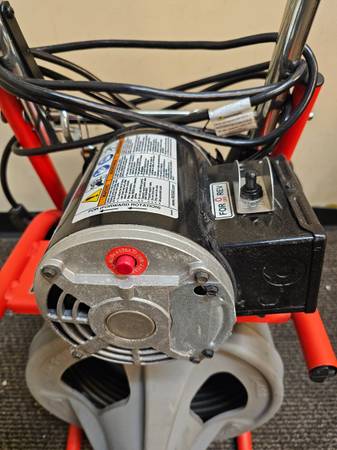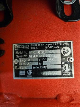 Master even the toughest of drain clean jobs with the strength of the Ridgid K-400-13 Drain Cleaning 120-Volt Drum Machine Kit. This drain cleaning machine with a sleek profile and user-friendly design includes an induction-style belt motor that spins at 165 RPMs, manual controls and a solid core cable. It offers reliable power that cleans even the toughest of everyday 1-1/2 in. to 4 in. drain line blockages in tubs, showers, and sinks hassle-free. The corrosion-resistant cable drum comes with 75 ft. of 3/8 in. diameter rugged and kink-resistant C-32 Integral Wound solid core cable that is ideal for 1/2 in. to 3 in. drain lines. The integrated transport cart features large heavy-duty wheels that easily navigate over bumps and stairs for convenient and easy movement to and from the job site. The fold over handle allows for easier mobility and storage. If the head gets lodged in blockage, the integrated cable control system will cause the drum to stop spinning to limit the potential for cable to flip over in the drum as well as conveniently indicate when blockages are encountered to the user. This product was pre-owned but is in great condition!
