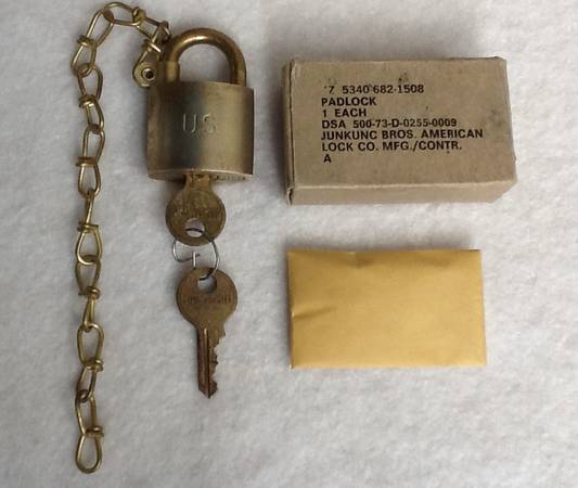 I have a new-old-stock NOS American Lock Co. Mfg./Junkunc Bros. US Brass Padlock with 9" chain, 2 keys and original box. This vintage U.S. military-grade padlock is marked as manufactured by Junkunc Brothers Company successors to the American Lock Company.
